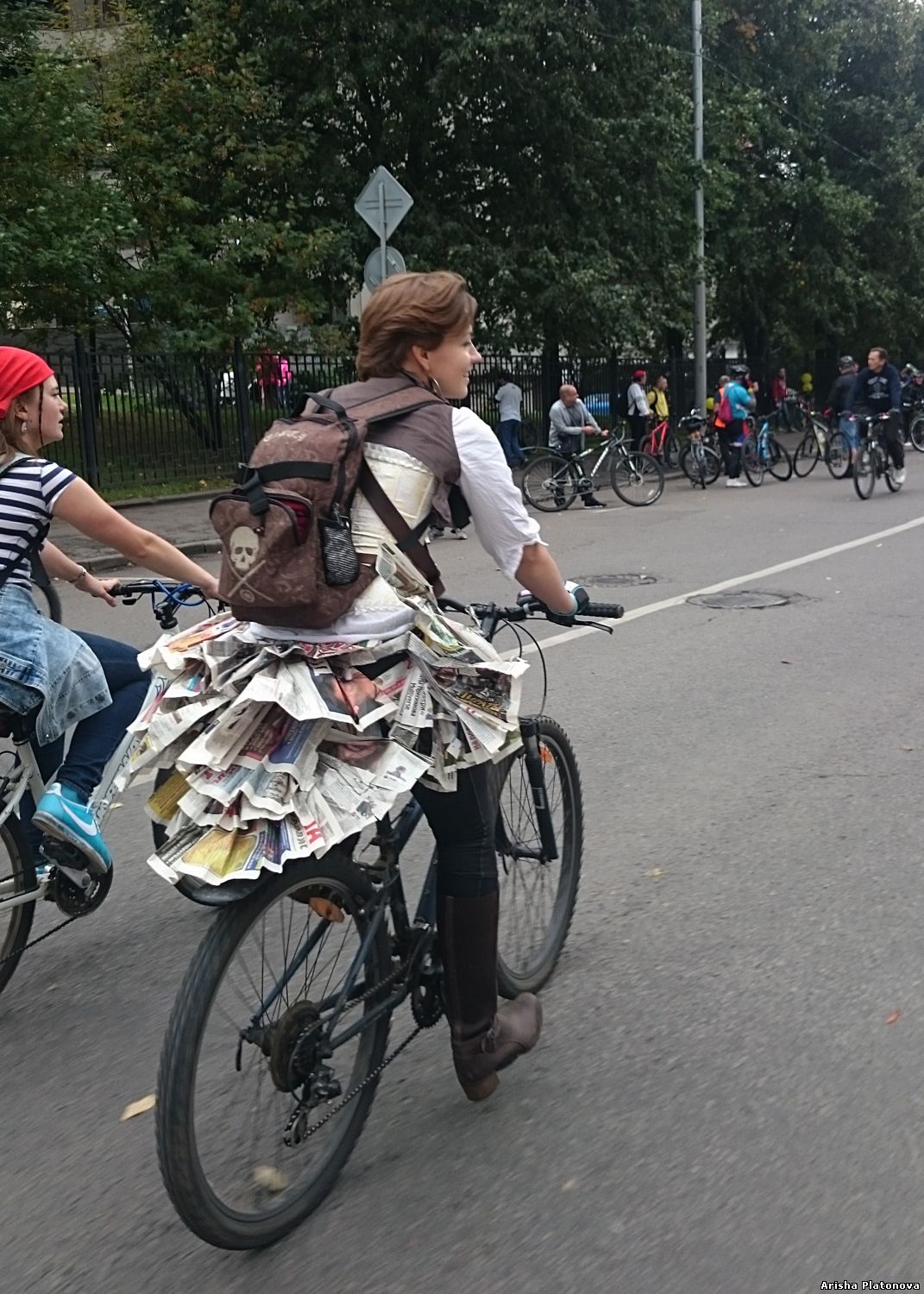 Чем ближе я приближалась к месту сбора, тем больше попадалось по пути людей на велосипедах. И вот я на месте за час до начала мероприятия. От разнообразия нарядов, различной музыки, моделей велосипедов и общего настроения людей на моем лице непроизвольно играла улыбка. Почти на всех велосипедах были привязаны воздушные шарики и я отправилась на их поиски. Вскоре я стала тоже обладателем нескольких шаров, еще у меня появились веселые очки в форме велосипеда, звонок и несколько светоотражающих браслетов. До старта оставалось полчаса и я пошла занимать очередь в колонне.